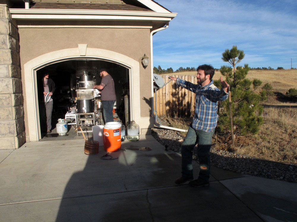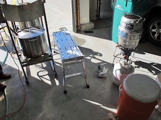 I had to skip Saturday's Rocky Mountain Brewery Ugly Sweater Party and the Bierwerks Homebrew Party because I needed to finish my grading, but on Sunday I was back at it. Isaac had invited me over to do some homebrewing with him and with Grant of Rocky Mountain. I didn't bring my equipment, I just hung out. But I did bring over a bottle of Scotch so we could make Hot Scotchies with the beer wort and I brought over a bottle of Widmer Brothers Brewing Brrrbon - their winter beer aged in bourbon barrels. Grant brought a growler from Rocky Mountain and a guy named Lefty brought a 2003 and a 2008 Avery Brewing Beast Grand Cru. Those were phenomenal beers. There were many other beers, too many to name, but I will say that we had a Deschutes Jubelale, which is one of my favorite beers, a Maui Brewing Coconut Porter because those were just released to Colorado markets last week, and a really great IPA from Great Divide Brewing. Here's a look at Grant's homebrew setup on the right, and a glimpse of Isaac's on the left.