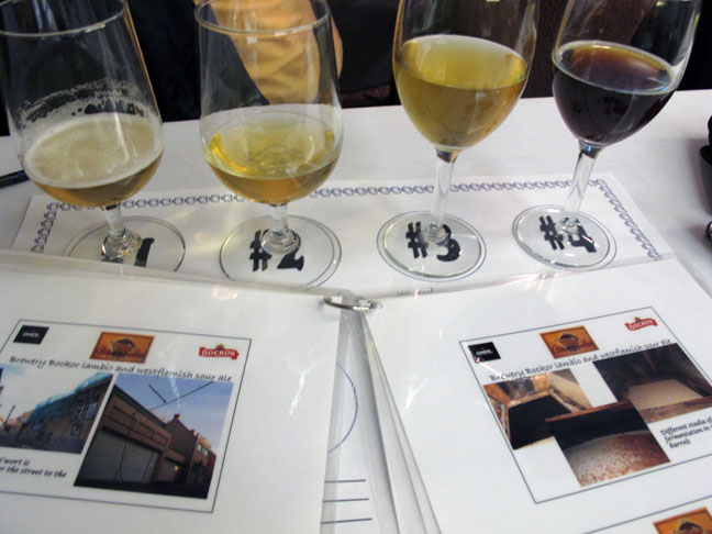The event that ended up being my favorite of the whole weekend was the 10am seminar "Brewing Outside the Box: Brewers Gone Wild" centering on the topic of sour beers. I felt bad that many people were turned down at the door because there wasn't enough room. We heard from Sean Knoll of Artisinal Imports, Adam Avery of Avery Brewing, and Tomme Arthur of Lost Abbey Brewing. Sean Knoll brought us four very special beers. The first three were various stages of Lambic, the first beer being totally fresh and hoppy. I've never seen a lambic at this stage so it was really a treat to try this. The next beer was a 50/50 blend of that lambic with an 18-month aged version of it. This beer was beautifully sour, the hop presence was not evident to me, but it was still sweet due to the presence of the fresh beer. The third beer was a 100% aged version, which was very sour and uncarbonated but still really tasty. Finally we tried the Cuvee de Jacobins commercial version, which is the 100% aged beer but with some malt extract added for body and carbonation. The beer was fantastic and this portion of the workshop was one of the more memorable beer experiences I've ever had.