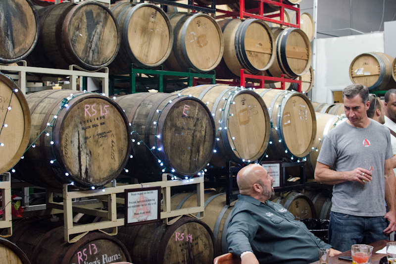 | A view of Avery's Barrel Room with Adam Avery talking with Dr Bill of Stone Brewing. |