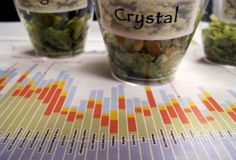 Each brewer poured a beer, and for each beer we were given three handfuls of hops that went into it. We were encouraged to handle the hops and smell them. We then made notes on how each were different and then we looked for these notes in the aroma and flavor of the beer itself. In some cases I found myself lying to myself about what I was smelling, but at other moments I was certainly able to discern the difference between hops.