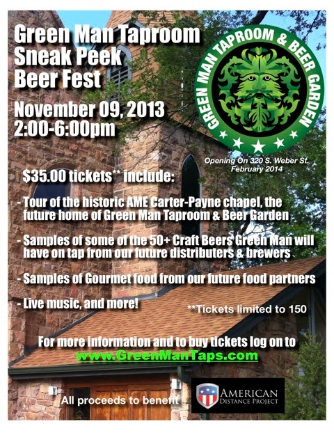 What Falling Rock is for Denver, or Mayor of Old Town is for Fort Collins, Green Man Taproom and Beer Garden is hoping to be for Colorado Springs. This city has been missing a spacious taproom with beer garden and an extensive beer list. Owners Scott and Petra Simmons are hoping to fill this void with Green Man. They have been visiting breweries and taprooms for years, taking pictures and notes of the good and the bad.This weekend you can get a bit of a preview of Green Man Taproom, a tap house and potential beer garden (city approval for the latter is still pending) featuring 50+ taps, slated to open in February 2014. They are holding a sneak peek beer festival this Saturday, November 9th from 2-6pm at 320 S. Weber Street. The festival will feature beers from distributors and local brewers that the taproom will showcase.